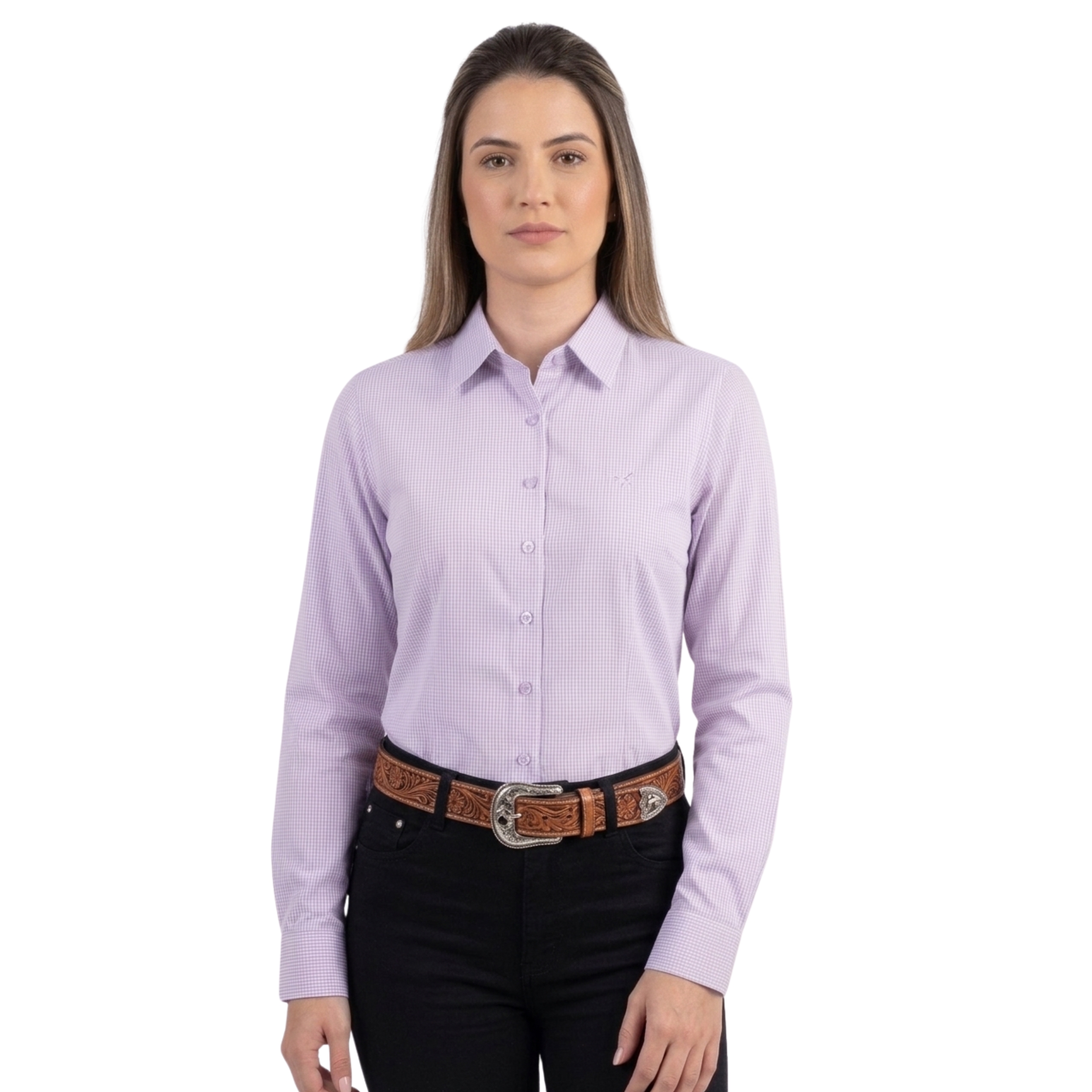 A camisa possui corte estruturado com golas tradicionais e botões frontais, além de bolsos frontais com aberturas por botões. O ajuste é feito para favorecer o toque feminino sem perder funcionalidade. O algodão traz uma sensação confortável mesmo após horas de uso.